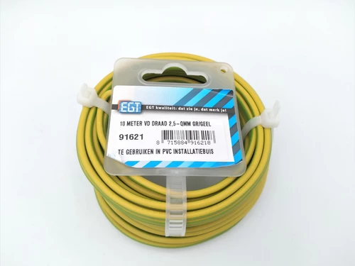 Installatiedraad is er in verschillende kleuren. Zo is de fasedraad bruin en wordt deze zwart als deze voorbij een schakelaar is geweest, dan heet het schakeldraad. De aardedraad is de geel-groene draad en de nuldraad is altijd blauw. Als u een installatie van voor 1980 hebt dan kan het zijn dat u nog rode, groene en grijze draad tegenkomt. Rood is blauw geworden, groen werd bruin en grijs is de geel-groene aardedraad. Wij verkopen deze installatiedraad op verschillende formaten rollen.