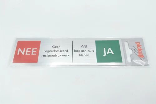 In onze winkel vindt u verschillende stickers en emaillen of aluminium bordjes tégen of vóór het ontvangen van huis-aan-huis bladen en reclamedrukwerk. Hierbij heeft u keuze uit nee-nee, ja-nee, ja-ja, en nee-ja. Met deze stickers en bordjes voorkomt u onnodige stapels met post en verspilt u geen papier. Door het aanbod van deze borden en stickers van verschillende materialen vindt u gegarandeerd iets wat goed bij uw deurbeslag past!